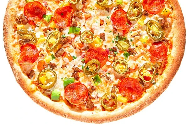 Соус Бургер, сыр моцарелла, пепперони, перец халапеньо, помидоры, перец болгарский, лук красный, зелень, чеснок.